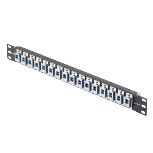 Introducing the L-com PR175F504B3-3BA-S, a 16 port, 19" x 1.75" rack panel designed for seamless connectivity and optimal performance. The one-piece flange USB 3.0 adapters feature a B Type Female to A Type Female connection, ensuring seamless compatibility with a wide range of devices. The rack panel is mounted with L-com’s ECF504-3BA-S, 3.0 USB Chrome Plated Shielded ABS, silver coupler, providing superior shielding and durability.