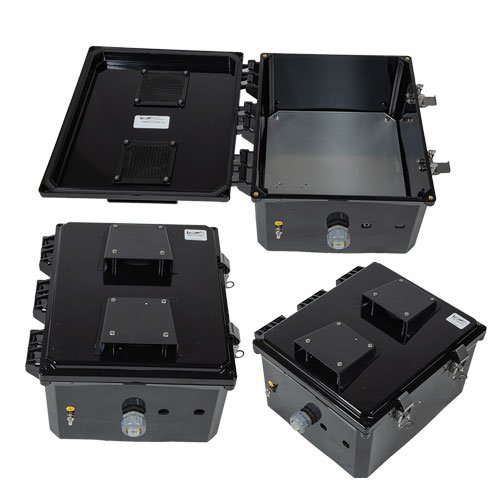 The box is a rugged weatherproof enclosure that is ideal for both indoor and outdoor applications. Constructed from High-Impact, UV Resistant Polycarbonate material that provides superior durability to impacts and ease of modification while maintaining minimum weight. It is well suited for high temperature or corrosive environments. The lid includes two vents with installed rain guards and filters. The included wall mount brackets come uninstalled and bagged with their hardware inside of the enclosure. Once the brackets are installed the enclosure can be mounted directly to any flat wall surface provided proper screws are used into secure studs. The brackets, once installed, also allow you to use our HGX-PMT pole mount kits. The lid features a non-metallic hinge system that allows for quick removal & can be reattached just as quickly without the need for any tools. The enclosure comes with a pair of stainless-steel latches with padlock eyes allowing you to secure the enclosure from tampering. The enclosure comes in black.