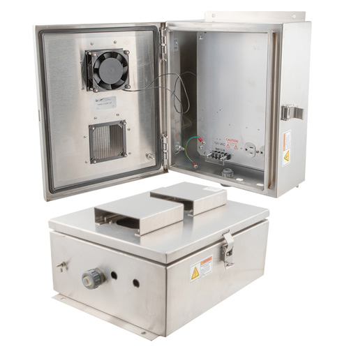 - Features aluminum mounting plate with surge protected duplex 120 VAC outlets & thermostat controlled heating & cooling system