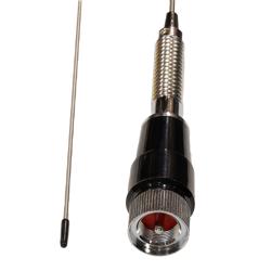 Our omnidirectional antenna with vertical polarization has an impedance of 50 Ohms. This dual-band antenna has a maximum input power of 150 Watts. The LCANRBD1082 high power whip antenna can withstand temperatures ranging from -40 to 80 degrees C. This antenna has an overall length of 32.48 inches, a height of 0.93 inches, and a weight of 0.397 lbs.