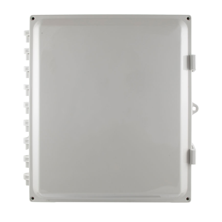 The box is a rugged weatherproof enclosure that is ideal for both indoor and outdoor applications. Constructed from High-Impact, UV Resistant Polycarbonate material that provides superior durability to impacts and ease of modification while maintaining minimum weight. It is well suited for high temperature or corrosive environments. The shallow depth design while maintaining industry standard height/width dimensions is ideal for low profile applications.