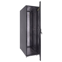 The L-com LC42USRC1000GDFRCM 42U commercial network server cabinet has the capacity and quality needed to complete your high-density applications that rack and store a variety of 19-inch equipment such as servers, patch panels, PDUs, routers, and more. This commercial cabinet is heavy-duty, with the 42U version supporting a static equipment weight capacity of 3000 lbs. Our cabinet is easily assembled for quick installation and contains heavy-duty locking casters for movement and leveling feet for usage when the fully racked cabinet must remain in place. This network enclosure features adjustable square cage nut mounting rails with RU-markings. The cabinet also incorporated full-height wire management rails, which made it easier to finish a neat and clean installation. The mounting rail depth is marked and adjustable in 10 mm increments between 6 and 29.5 inches. The rack's welded structure is made of heavy-duty cold rolled steel and has a long-lasting, elegant black powder coating.