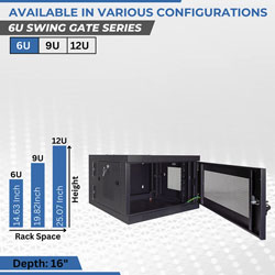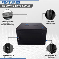 Our swing gate network cabinet includes all necessary hardware, including door keys, mounting anchors, and a grounding lug, for a quick and simple installation. This hinged swing out server network rack cabinet measures 14.63 inches high, 23.63 inches wide, and 21.63 inches deep. Our 6U wall mount server cabinet complies with CE, EIA/ECA-310-E, HIPAA, NEMA Type-1, and PCI.
