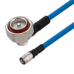 These RF coaxial cable assemblies are built with right angle 7/16 DIN connection on one end and NEX10 connection on the other. This right angle 7/16 DIN to NEX10 cable from L-com has a male to male gender combination. Our 7/16 DIN male to NEX10 male coaxial assembly part number LCCA31040-M1 can also be known as right angle 7/16 DIN plug to NEX10 plug cable assembly when using alternate gender names.