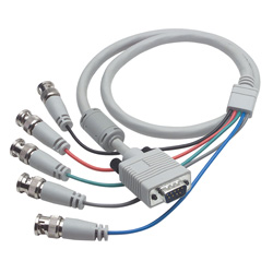 This series of VGA video breakout cables utilizes five 75 Ohm coaxial cables with true 75 Ohm BNC connectors for distortion free video signal transmission. The fully molded DB9 backshell and BNC strain relief produces a durable assembly. Individual cables are color coded Red, Green, Blue, Black and White to assure correct hookup. Available in standard lengths of 3 and 6 feet.