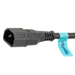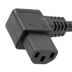 This cable is built with 3 14 AWG conductors and is rated for 15 Amps and 250 Volts. The C14 plug and C13 receptacle make it perfect powering PCs and PDUs. The right angle C13 connector makes is suitable for fitting behind equipment that is backed up to a wall, also improving airflow.