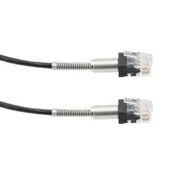 The L-com TRD630A-DS-BLK-50F Category 6a double spring slim Ethernet cable assembly is intended for use in high-density environments where space is limited. This 10 gigabit Ethernet cable features RJ45 male plugs with spring boots and can be used to reduce congestion in high-density environments like data centers and rack panels. Our black Ethernet patch cord is 30 AWG stranded and takes up less than a half of the space of a standard 24 AWG patch cable.