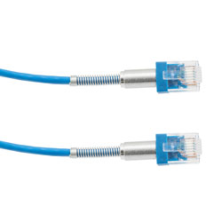 The L-com TRD630A-DS-BLU-15F Category 6a double spring slim Ethernet cable assembly is intended for use in high-density environments where space is limited. This 10 gigabit Ethernet cable features RJ45 male plugs with spring boots and can be used to reduce congestion in high-density environments like data centers and rack panels. Our blue Ethernet patch cord is 30 AWG stranded and takes up less than a half of the space of a standard 24 AWG patch cable.