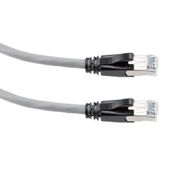 This Ethernet patch cord features RJ45 male connectors on both ends and 50µ minimum gold-plated contacts for reliability. The F/UTP-shielded Ethernet cord TRD626ASR-GRY-5F from L-com has a voltage rating of 300 V. Our twisted pair cable can withstand temperatures ranging from -20 to 75 degrees C and has 4 twisted pairs and 8 wire strands.