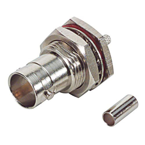 This female BNC bulkhead style RF connector is designed for crimp attachment to the widely used RG179/187 75 Ohm coaxial cables. The standard .5 inch single D bulkhead design is commonly found on many panel designs. BNC connectors connect with a twist lock, making them popular for RF applications.