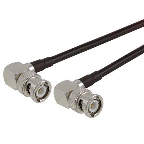 High quality fully tested BNC Male to BNC Male cable assemblies featuring high performance low loss 195-series coax cable. Types include straight and right angle BNC connectors.