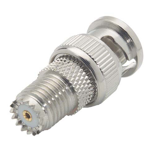 This Mini UHF female to BNC male coaxial adapter provides the ability to connect between a Mini UHF male and BNC female interface. Interconnection of these interfaces is often found in test lab or in field environments where devices of differing interface types are interconnected.