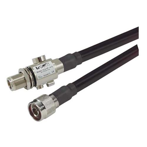These cable assemblies feature L-com's CA-400 which is a UV resistant polyethylene jacketed high performance flexible low loss coaxial cable. Attached directly to the cable is L-com's AL6-NF-14-9 5.8 GHz coaxial lightning protector. With a replaceable gas tube element, multi-strike capability and fast response time, they are suitable for a wide range of applications. A ground lug and terminal is provided directly on the lightning protector housing, which provides superior grounding.