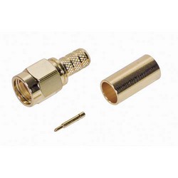 This male SMA connector is designed for crimp attachment to RG58 coaxial cable utilizing readily-available crimp tools with standard crimp sizes: .213" for the crimp ferrule and .039" for the pin. This 50 Ohm subminiature connector utilizes a threaded coupling mechanism making it a popular choice in higher frequency applications.