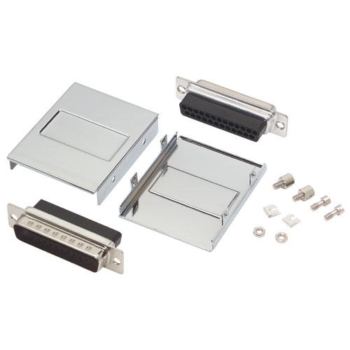 Create your own DB25 adapters with these versatile adapter kits. Kits include two rugged bright chrome plated steel shielded snap-on covers, two crimp & poke connectors and mating hardware. Choose among male-male, male-female or female-female genders. These crimp style connectors conform to commercial industry standards and can be used with any standard male D-sub contact, including L-com's CPM family of contacts. Pre-terminated jumper wires are available separately, part number family RA50 (pkg 10pcs).
