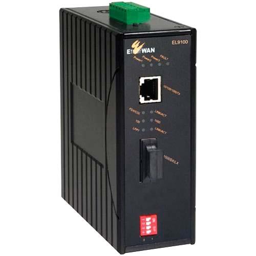 The The EtherWan EL9000 series functions at temperatures ranging from -40°C to 75°C (-40°F to 167°F) and is tested for functional operation @ -40°C to 85°C (-40°F to 185°F). Whether on the factory floor or the street corner, the EL9000 will provide flawless communications when you need it most. The EL9000 series supports multi-mode/single-mode fiber optics. The RJ-45 port on this unit provides Auto-MDIX and auto-negotiation. The linkfault- pass-through feature allows the network management agent on adjacent equipment to react to a broken link. Flexibility is the main feature of the EL9100, it may be DIN rail or panel mounted, and comes with power options to match the applications that require a tough, environmentally hardened, Gigabit Ethernet media converter.