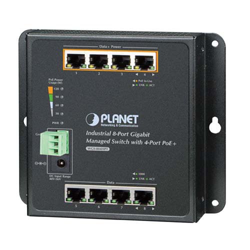 Designed to be installed in a wall enclosure or simply mounted on a wall at any convenient location, Planet WGS-804HPT, an innovative, Industrial 8-port 10/100/1000T Wall-mounted Managed Switch with 4-Port PoE+, offers IPv6/IPv4 dual stack management, intelligent Layer 2 management functions, and user-friendly interface. The WGS-804HPT is able to operate reliably, stably and quietly in any environment without affecting its performance. With a total power budget of up to 144 watts for different kinds of PoE applications and featuring ultra networking speed and operating temperature ranging from -40 to 75 degrees C in a compact but rugged IP30 metal housing, the WGS-804HPT is an ideal solution to meeting the demand for the following network applications: