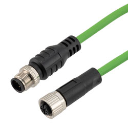 The TRGA502S-P2N-3M green-colored cable assembly from L-com features a 22 AWG conductor and PUR (polyurethane) jacket with drag chain ratings. Industrial drag chain jackets ensure that the cables can be flexed and endure damage that would destroy a typical PVC cable. For end-to-end connections, this shielded M12 sensor actuator signal cable comes with a male to female connectors. This IP67-rated waterproof cable is used to connect M12 devices that utilize a 5-position, A-code (single keyway) connector, such as sensors and actuators.