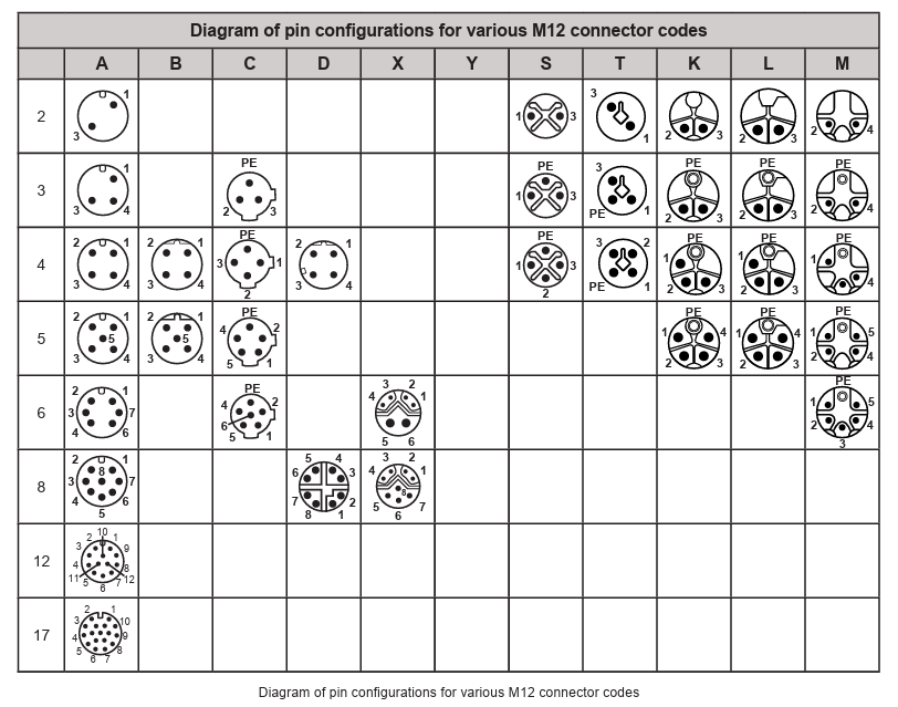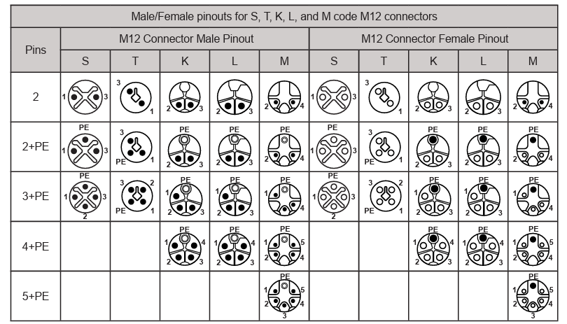 *PE typically refers to “Protective Earth”, this is a connection to ground that is used for safety purposes to protect users and equipment from electrical discharge in case of a fault. The PE pin is generally connected to the ground pin on an electrical supply plug or other connector ground. It is important to note that a ground pin in a connector may be a PE, but is not necessarily so, but every PE should only be used as a ground pin. A-CodeA-code M12 connectors are also known as Micro-DC connectors and was one of the first styles of M12 connectors introduced. This style is widely used in factory automation applications, including sensors, actuators, control signals, and 1 Gbps data transmission. This connector can be used to power low-power DC motors and motor-operated switches. The data transmission on this connector is adequate for some machine vision applications, security, and Ethernet to 1 Gbps. The utility of this code is why A-code M12 connectors can be found in a wide range of industrial and enterprise applications from factory automation/control, transportation, agriculture, renewable energy, and telecommunications. B-CodeB-code M12 connectors are specifically designed for use with fieldbus connections, including PROFIBUS and Interbus. Unlike other M12 connectors, the B-code is designed with a reversed single keyway. This allows for 2 distinct M12 connections to be mounted on the same panel without the risk of accidentally interconnecting the two systems. This is useful for installations that have different voltage/current configurations. C-CodeC-code M12 connectors are sometimes also called Micro-AC and are typically only used for AC power applications. This could be bringing AC power to actuators, sensors, and other AC devices, such as factory automation equipment. These M12 connectors all have extended grounding pins and double keyways to ensure that improper insertion isn’t possible D-CodeD-code M12 connectors are almost exclusively used for industrial Ethernet applications but may also be used for f ieldbus applications such as Profinet/Interbus, EtherCat, PoE (Power over Ethernet) or Ethernet/IP use cases. This code enables data transfer rates to 100 Mbps. The 4-wire setup of this connector accommodates 2-pairs of Cat 5e twisted pair cables. To allow for all 4 pairs of Cat 5e twisted-pair cables to be connected in single housing, 8-pin/wire A-code can be used. X-CodeX-code is a more recent addition to the M12 connector styles. This code is now commonly used for high-speed industrial Ethernet applications and can transfer to 10 Gbps of data. This high rate of data transmission is possible with X-code connectors as the pairs of Ethernet wires are galvanically isolated using a metal structure within the connector housing. As many systems are moving to higher data rate Ethernet and transfer speeds, it is likely that X-code M12 will eventually replace A-code and D-code M12. X-code M12 connections can accommodate Cat 6A and Cat 7 connections and has 8 dedicated pins for full Ethernet 4-twisted pair connections. X-code is also capable of providing power via PoE (Power over Ethernet) to supported devices. Y-CodeY-code M12 connectors are a type of hybrid connector that includes 4 pins for data connections and 2 or 4 pins for power connections. This code has the same capability as D-code for data transmission but can also include 2 or 4 power pins that function similarly to A-code for a highly compact interconnect solution. Y-code connectors can be used for fieldbus applications and EtherCAT. The Y-code designation comes from the “Y” shaped face of the connector that is intentionally split to separate the data and power pins. This code is capable of up to 50 V AC/DC and 6A on the power pins or 0.5 A on the signal pins. S-CodeS-code are among the newer M12 connector codes and will likely eventually replace C-code M12 parts. This code is designed for AC power applications to 630 VAC and 16A in either 1-phase, 2-phase, or 3-phase versions. The 3-phrase S-code connector is capable of 7.5 kW of AC power transmission, which makes it ideal for low-power AC motors, motor-controlled switches, and frequency converters. ![]() Male/Female pinouts for S, T, K, L, and M code M12 connectors T-CodeT-code M12 connectors are similar to S-code but are designed for DC applications to 63VDC and 12A per contact. This code is often used for fieldbus or Ethernet applications and can carry up to 750W of DC power, to power low-power DC motors/drives. It is likely T-code M12 connectors will eventually replace A-code connectors for DC power applications. L-CodeLike T-code connectors, L-code M12 connectors are designed for use to 63V, but to 16A. This is ideal for high current but low voltage DC applications, such as fieldbus and Ethernet I/O boxes. L-code can also be made with a 4 pin with additional PE contact, where T-code is only available to 3 pin with PE contact. K-CodeK-code M12 connectors are similar to S-code connectors, but some with an additional 4 pin and PE contact configuration. This code is also capable of 800V AC transmission with 16A per contact for a total of 10kW of AC power transmission per connector. This code is ideal for high power AC connections for motors and drivers. M-CodeM-code M12 connectors are designed for up to 3-phase AC power transmission to 630V and 8A per contact. This code includes a PE for each pinout style except for a 2 pin style which does not include a PE contact. P-CodeP-code M12 connectors are designed for up to 4 pin positions with a PE. These connectors are designed for data and can accommodate 2 twisted pair Ethernet connections at maximum pin positions. Though this connector type can be used for various functions it is generally used for EtherCAT applications. Recommendations