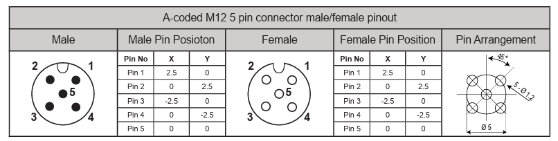 What Is an M12 Connector?The boom of automation technologies is a direct result of the successful transition to electrical/electronic controls, power, and sensing that is dominating most modern technologies. This electrification enables automated control, data gathering, and intelligence that were previously unattainable. Part of this success story is the M12 connector. Due to the standardization of the M12 connector and the design-in versatility of this connector type, it has emerged as the preferred interconnect standard for the automation sector. M12 cables come in kits that are assembled by the user or as pre-wired, pre-molded, and pre-tested cables, which are generally the more popular solution as they are easy to use, install, and typically have high reliability figures. Originally used for sensor interconnect, M12 connectors have evolved to now include configurations and pinouts for new applications and sectors beyond automation. This is why M12 connectors can be found that feature interconnects specifically designed for Ethernet, digital signals/data, analog signals, and power (AC/DC). There are even hybrid M12 connector configurations that allow for multiple signal types in the same connector. Regardless of the configuration, M12 connectors are designed for harsh industrial environments and include features that make this connector solution ideal for most environments. M12 Connector CodesM12 connectors are a circular 12-mm diameter threaded head that was originally designed for corrosive environments. From this, M12 connectors are designed with features to ensure they are waterproof and operate over a wide temperature range from -40°C to 85°C. M12 connector housings are most often made from highgrade stainless steels or plated brass/nickel to prevent corrosion and rust. Given the modern diversity of applications M12 connectors are used in, the major stakeholders in M12 connectors have converged on a code-based nomenclature to describe the various M12 connector configurations to ensure compatibility. The M12 standards derived for this also dictate implementations and applications for the cordsets with the given codes. This helps to ensure that the appropriate cabling is always used for the right application, to avoid hazards, equipment damage, and defects. For instance, it could easily be tragic if medium voltage AC or DC was energized along the M12 connection meant for low voltage analog sensor signals. This is why the M12 standards for codes also include exact dimensions of the connectors/cables, environmental performance, mechanical behavior, and all relevant tolerances. Of these, DIN EN 61076-2-101 is a long-established standard that covers M12 codes A, B, C, and D, which are designed for sensor and control signals mainly, but can account for low-voltage/low-power applications used for most sensor and light data Ethernet. IEC 61076-2-111 covers S, T, K, and L codings, which are used for AC and DC power. DIN EN 61076-2-109 covers X coding used for CAT 6 and higher ISO/IEC 11801 Ethernet to 10 GBit/s. DIN EN 61076-2-113 covers the Y coding, which is most often used for low power signal, power, and Ethernet transmission to 100 Mbit/s. ![]() The keyways are made in such a way that mating of different types and pin number isn’t possible. It is not readily clear without additional labeling what exact type an M12 connector may be without examining the internal structure of the connector. This is why having a key insertion mechanic is necessary to avoid accidental interconnection of various circuits. Moreover, there are standard pinout color coding and pinout identification patterns that are generally accepted for M12 connectors. The exact pin designations and colors depend on the M12 connector code and number of pins. Each M12 connector is designed with exact positions for each pin with both x, y, and rotational tolerances. ![]() A-coded M12 5 pin connector male/female pinout ![]() Color coding for an A-code M12 5 pin connector. The keying and pinout patterns are different for every M12 connector code and pin number. With sufficient familiarity a user should be able to identify a given M12 connector by the keying to identify the code and the number of pins to determine the exact M12 connector style. Otherwise, a simple identification chart like that depicted in Figure 1 should be adequate. Some suppliers include the pin IDs on the M12 connector face, which can aid in troubleshooting and maintenance when a connector may need to be serviced or repaired. Along with cable assemblies, there are also M12 adapters, field termination connectors, splitters, multi-channel splitters, and bulk-head connector types. Hence, color-coded pinouts are useful to ensure proper connections during installation/hook-up, troubleshooting, and maintenance. Quick Guide to M12 Connector Codes & Pins
