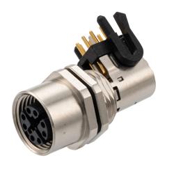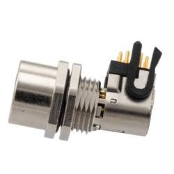 M12 Shielded Panel Mount Connector, IP67 8 Position X-code Female Receptacle, Right Angle PCB Solder, M12 Rear Mounting Style