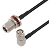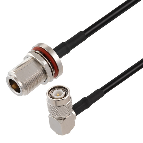 These RF coaxial cable assemblies are built with N bulkhead connection on one end and right angle TNC connection on the other. This N to right angle TNC cable from L-com has a female to male gender combination. Our N female to TNC male coaxial assembly part number LCCA30692-FT2 can also be known as N jack to right angle TNC plug cable assembly when using alternate gender names.