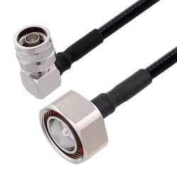 These RF low PIM coaxial cable assemblies are built with right angle N connection on one end and 7/16 DIN connection on the other. This low PIMright angle N to 7/16 DIN cable from L-com has a male to male gender combination. Our N male to 7/16 DIN male coaxial assembly part number LCCA31001-FT3 can also be known as low PIM right angle N plug to 7/16 DIN plug cable assembly when using alternate gender names.