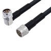 These RF low loss coaxial cable assemblies are built with N connection on one end and right angle N connection on the other. This low loss N to right angle N cable from L-com has a male to male gender combination. Our N male to N male coaxial assembly part number LCCA30159-FT6 can also be known as low loss N plug to right angle N plug cable assembly when using alternate gender names.
