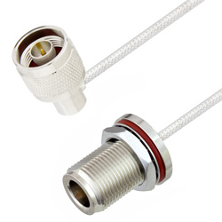 Maximum frequency for these N to N M/F cables is 11 GHz. Technical performance specifications on these 11 GHz N right angle male to N female bulkhead cables are located on the LCCA30122-FT1.5 datasheet PDF along with CAD drawing and dimensions. The L-Com RF cable assembly data sheet with specs, drawing dimensions can be found on this product page just above. Our Custom Cable Configurator is where to find and build customized versions of this RF coaxial assembly or many other connectors and coax combinations that all ship the same-day. This product can also be called a N female bulkhead to right angle N male cable assembly because it can be used in the opposite direction.