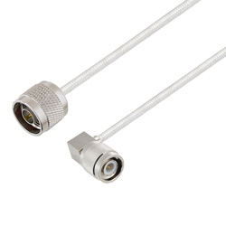 These RF coaxial cable assemblies are built with N connection on one end and right angle TNC connection on the other. This N to right angle TNC cable from L-com has a male to male gender combination. Our N male to TNC male coaxial assembly part number LCCA30445-FT6 can also be known as N plug to right angle TNC plug cable assembly when using alternate gender names.