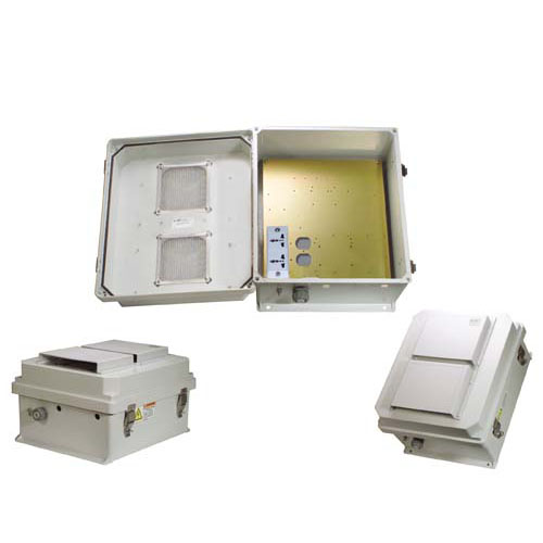 14x12x07 Fiberglass Reinf Polyester FRP Weatherproof Outdoor IP24 NEMA 3R Enclosure, 120-240 VAC Universal Outlet MNT PLT Vented Lid Gray
