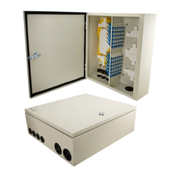 This Wall Mounted configuration permits positive fiber management, connectivity and distribution 72 incoming Fiber Optic cables channels. All the cross connectivity functions of Splicing, Termination, and Interconnection for your plant, backbone and in-building fiber cabling can be included in the enclosures to protect and ease the organization of your installations. This Wall Mount enclosure provides a professional economical solution for protection of critical network components. This IP54 rated enclosure is fabricated of SPCC steel and includes door with a gasket seal, secure latch & rubber grommets for cable entry and exit to provide easy access. Offering protection from moisture damage in stand-alone locations outdoors as well as in network closets.