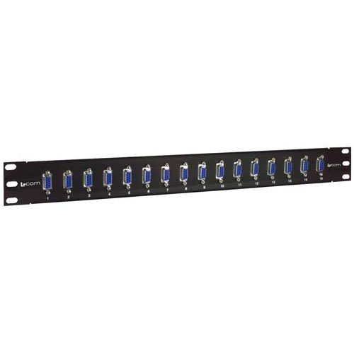 An L-com exclusive, four 19" x 1.75" rack panels are available with 16 shielded D-sub slimline couplers. Color of panel is black. Couplers female to female and fully shielded. Helpful white numbered legend printed 1-16.