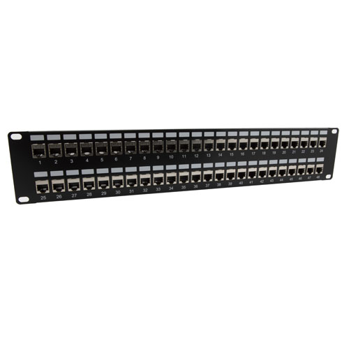 • 19" x 3.5" (2U) Rack panel with 48 Shielded Category 6 Keystone couplers for high-speed data applications provide protection against unwanted EMI/RFI emissions
