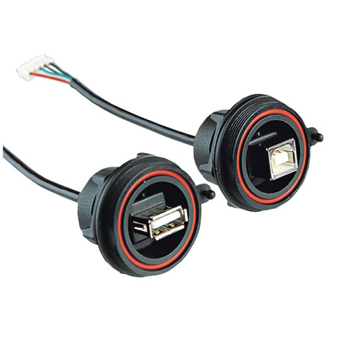 This IP68-rated dust- and waterproof connector is best suited to operators of high speed data networks in internal or external environments that require protection against the ingress of dust and moisture. Our USB 2.0 sealed A socket front of panel to 5 way crimp connector is made of glass filled PVC (PA) and meets UL94V-0 flammability standards.