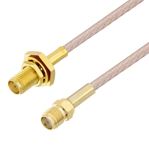 These RF coaxial cable assemblies are built with SMA bulkhead connection on one end and SMA connection on the other. This SMA to SMA cable from L-com has a female to female gender combination.