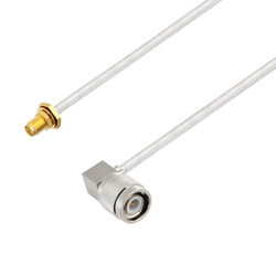 These RF coaxial cable assemblies are built with SMA bulkhead connection on one end and right angle TNC connection on the other. This SMA to right angle TNC cable from L-com has a female to male gender combination. Our SMA female to TNC male coaxial assembly part number LCCA30435-FT3 can also be known as SMA jack to right angle TNC plug cable assembly when using alternate gender names.