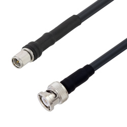 These RF low loss coaxial cable assemblies are built with SMA connection on one end and BNC connection on the other. This low loss SMA to BNC cable from L-com has a male to male gender combination. Our SMA male to BNC male coaxial assembly part number LCCA30257-FT2 can also be known as low loss SMA plug to BNC plug cable assembly when using alternate gender names.