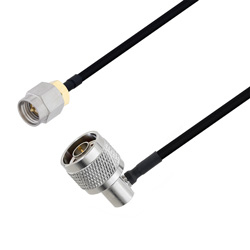 These RF coaxial cable assemblies are built with SMA connection on one end and right angle N connection on the other. This SMA to right angle N cable from L-com has a male to male gender combination. Our SMA male to N male coaxial assembly part number LCCA30474-FT2 can also be known as SMA plug to right angle N plug cable assembly when using alternate gender names.