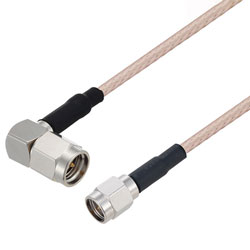 These RF coaxial cable assemblies are built with right angle SMA connection on one end and SMA connection on the other. This right angle SMA to SMA cable from L-com has a male to male gender combination.