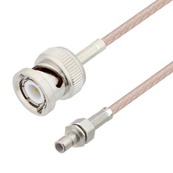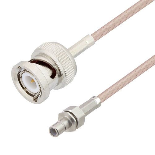 These RF coaxial cable assemblies are built with SMB connection on one end and BNC connection on the other. This SMB to BNC cable from L-com has a jack to male gender combination.