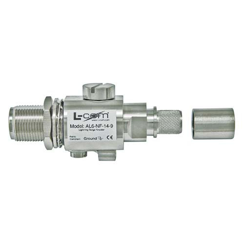 The AL6-NF-14-9 is designed to be attached directly onto a coax cable via the solderless crimp end of the protector. This helps improve insertion loss since a cable connector is eliminated. These protectors are for use with L-com's CA-400 low loss cable, LMR®400, TWS-400 and other equivalent low loss cable.