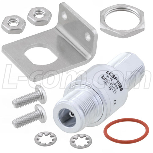 RF surge protector (also known as lightning arrester) LCSP1038 from L-com utilizing a proprietary gas tube surge protection technology protects critical hardware from lightening events while maintaining the RF performance. This RF surge protector component is manufactured in a coaxial in-line design with wide operating frequency range and available in stock with same day shipping.