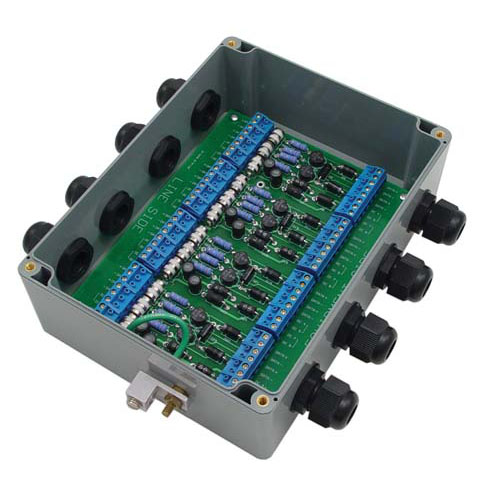 In the data path, the first stage of protection is a differential gas discharge tube. Stage two is a pair of current limiting series resistors and the final stage is a high speed, low capacitance diode clamp array. In the power path, the first stage is comprised of a differential gas discharge tube. Stage two is a dual low pass filter and the final stage is a triple array of bi-directional clamping diodes. The unit supports normal and reverse polarity PoE.