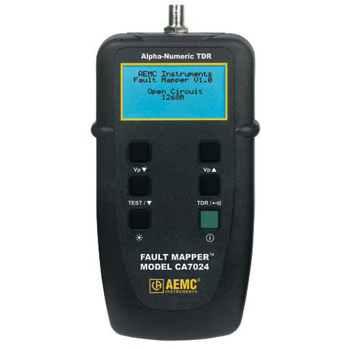 The AEMC Fault Mapper is a hand-held, alpha-numeric, TDR (Time Domain Reflectometer) Cable Length Meter and Fault Locator, designed to measure the length of electrical and communication cables. It can also indicate the distance to a fault in the cable (open or short), given access to only one end of a two or more conductor cable. By incorporating fast-edge step TDR technology, the CA7024 measures cable length and indicates the distance to open or short circuit faults to a range of 6000 ft (2000m), on virtually any type of cable. The CA7024 indicates the cable length or fault distance and description alpha-numerically on a 128 x 64 graphical LCD. Includes soft carrying case, BNC pigtail cable with alligator clips, four 1.5V AA batteries and user manual. Order online !