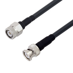 These RF low loss coaxial cable assemblies are built with TNC connection on one end and BNC connection on the other. This low loss TNC to BNC cable from L-com has a male to male gender combination. Our TNC male to BNC male coaxial assembly part number LCCA30266-FT5 can also be known as low loss TNC plug to BNC plug cable assembly when using alternate gender names.