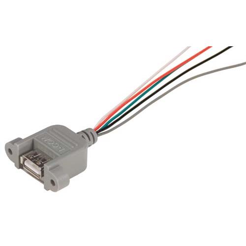 Another unique USB panel mount option allows the user the flexibility to configure their own assembly. It features a bulkhead Type A Jack with 24 inches of un-terminated lead wires. The user can cut the wires to the desired length and hard wire or terminate them with their connector of choice. Wires are 24 AWG, UL style 1007 and include a wire that is connected to the connector shell. L-com can custom terminate these wire leads with modest minimum requirements. Two screws are included to assist with panel mounting.